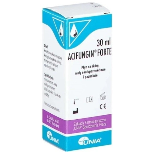 Acifungin Forte is a specialized topical antifungal solution designed for use on the skin, nail folds, and nails affected by fungal infections. Its powerful formula helps eliminate pathogens responsible for onychomycosis (nail fungus) and skin mycoses, restoring healthy skin and nail appearance.