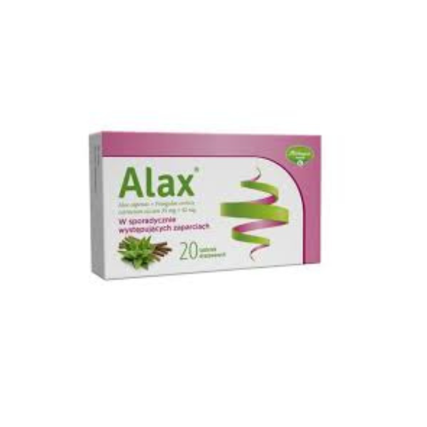 Alax is a natural-based laxative combining aloe extract (Aloe capensis) and rhubarb root extract (Rheum officinale) to support relief from occasional constipation. This plant-derived formula promotes gentle bowel movements by stimulating the intestines and supporting digestive regularity.