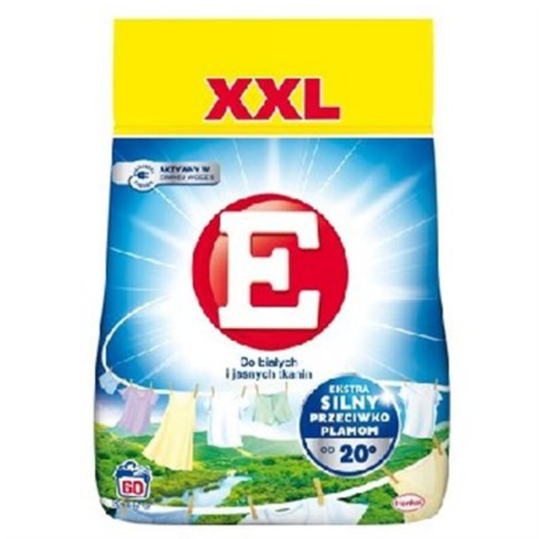 E XXL Laundry Detergent Powder is a powerful formula designed for washing white and light-colored fabrics, delivering exceptional cleaning results even at low temperatures starting from 20°C. This XXL-size pack offers 60 washes, making it both economical and effective for everyday laundry needs.