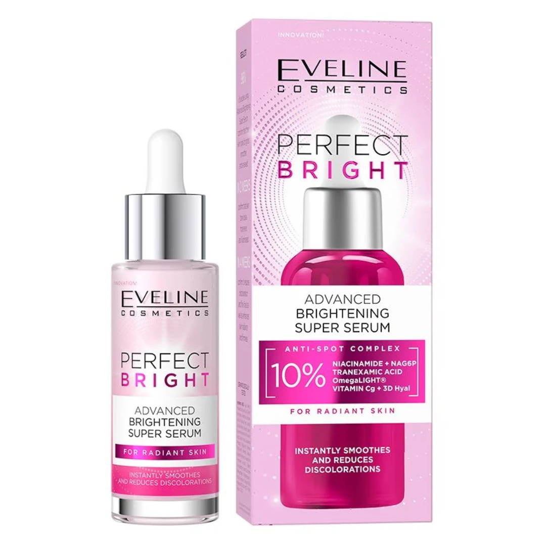 Eveline Cosmetics Perfect Bright Advanced Brightening Super Serum is a concentrated facial serum designed to help improve skin radiance and the appearance of uneven tone. The formula features a 10% Anti-Spot Complex combining niacinamide, tranexamic acid, Omegawhite™, vitamin Cg, and 3D hyaluronic acid, ingredients commonly used in brightening and smoothing skincare routines.