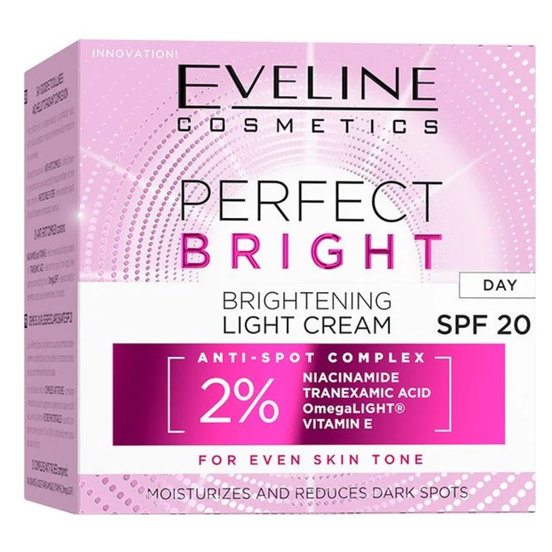 Eveline Cosmetics Perfect Bright Brightening Light Cream SPF 20 is a lightweight day face cream designed to moisturize the skin while supporting a more even and radiant complexion. The formula offers SPF 20 sun protection, making it suitable for everyday daytime use as part of a regular skincare routine.
