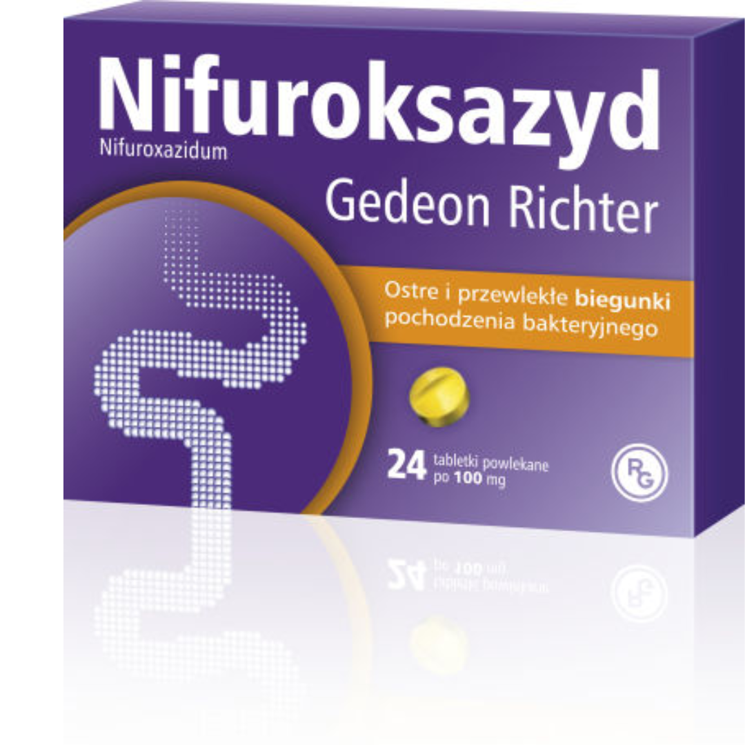 Nifuroxazide by Gedeon Richter is an oral antimicrobial medication used to treat acute and chronic diarrhea of bacterial origin. Each coated tablet contains 100 mg of nifuroxazide, an intestinal antiseptic that works locally in the gut without being absorbed into the bloodstream.