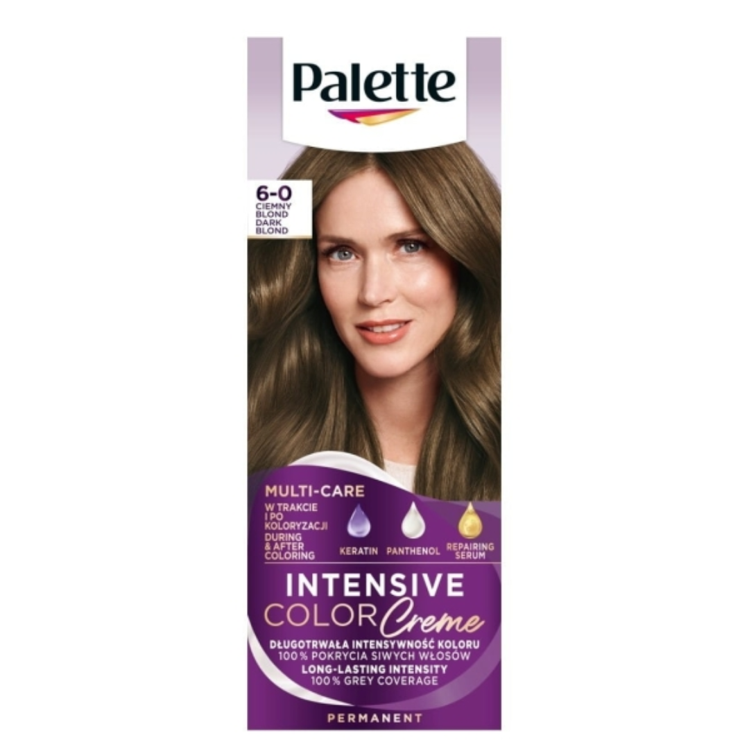 Palette Intensive Color Creme 6-0 Dark Blond delivers rich, long-lasting color with 100% grey coverage. This permanent hair dye provides deep, natural-looking dark blond tones while nourishing your hair during and after coloring. Infused with Keratin, Panthenol, and a Repairing Serum, it strengthens and protects your hair, leaving it soft, shiny, and vibrant. Enjoy salon-quality results and radiant color intensity that lasts.