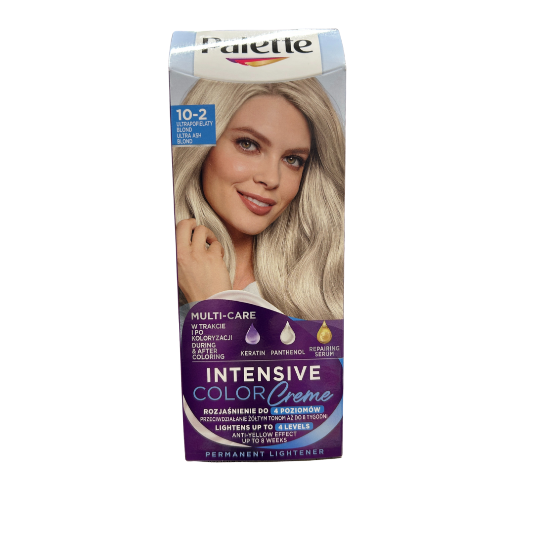 Palette Intensive Color Creme 10-2 Ultra Ash Blond is a permanent lightening hair dye designed to give you a cool, elegant blond tone with anti-yellow technology. It lightens up to 4 levels, offering bright, ultra-light ash results while neutralizing unwanted warm tones for up to 8 weeks. The formula is enriched with keratin, panthenol, and repairing serum, helping to protect and strengthen your hair during and after coloring.