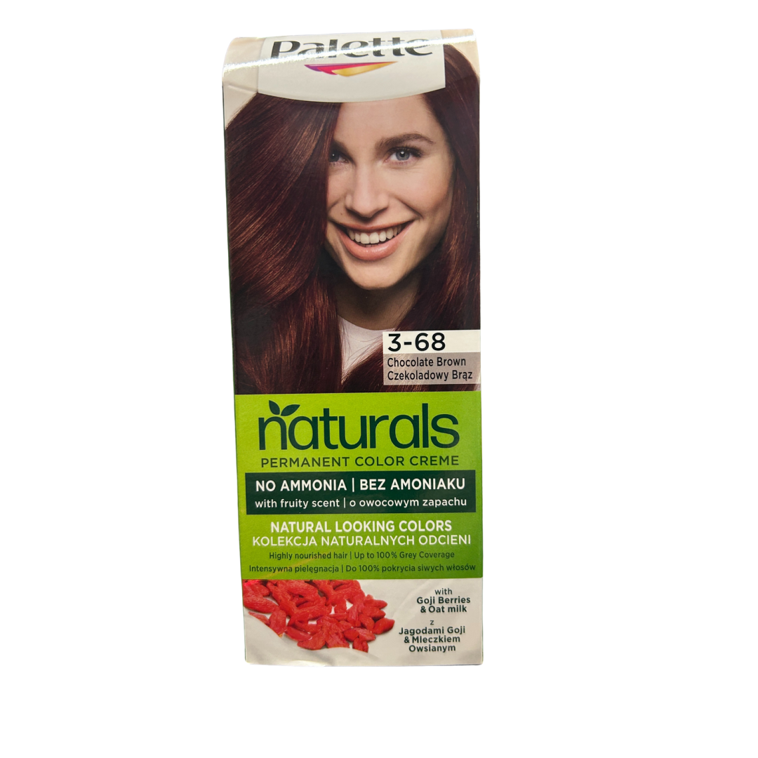 Palette Naturals 3-68 Chocolate Brown is a permanent hair color designed to give you a rich, natural-looking brown with a warm chocolate tone. The ammonia-free formula is gentle on the scalp and hair, offering up to 100% grey coverage and a pleasant fruity scent. Enriched with goji berries and oat milk, it deeply nourishes hair, leaving it soft, shiny, and vibrant. Perfect for those looking for long-lasting color and healthy-looking results.