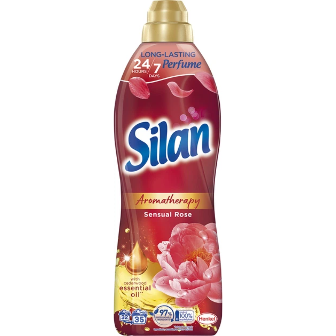 Silan Aromatherapy Sensual Rose fabric softener delivers long-lasting 24/7 freshness with a luxurious rose and essential oil fragrance while keeping fabrics soft and smooth.